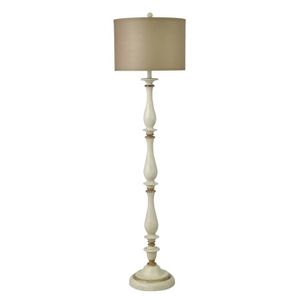 Shabby white floor lamp with gray round lamp shade.