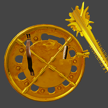 It s a makeshift weapon made of wheel disk with spikes welded to its frontal side shield and aluminium baseball bat with sharp metallic pieces around its tip mace.